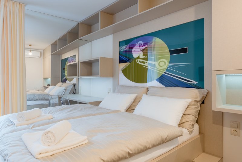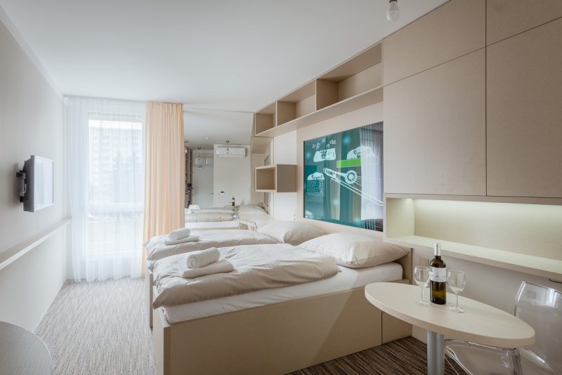 Samoobslužný koncept se týká i stravování, využití pracovních prostor s technikou a případně i dalších služeb. Exteriér i interiér této neobvyklé stavby výtvarně řešil umělec Jiří David a jeho instalace se staly funkční součástí hotelu.